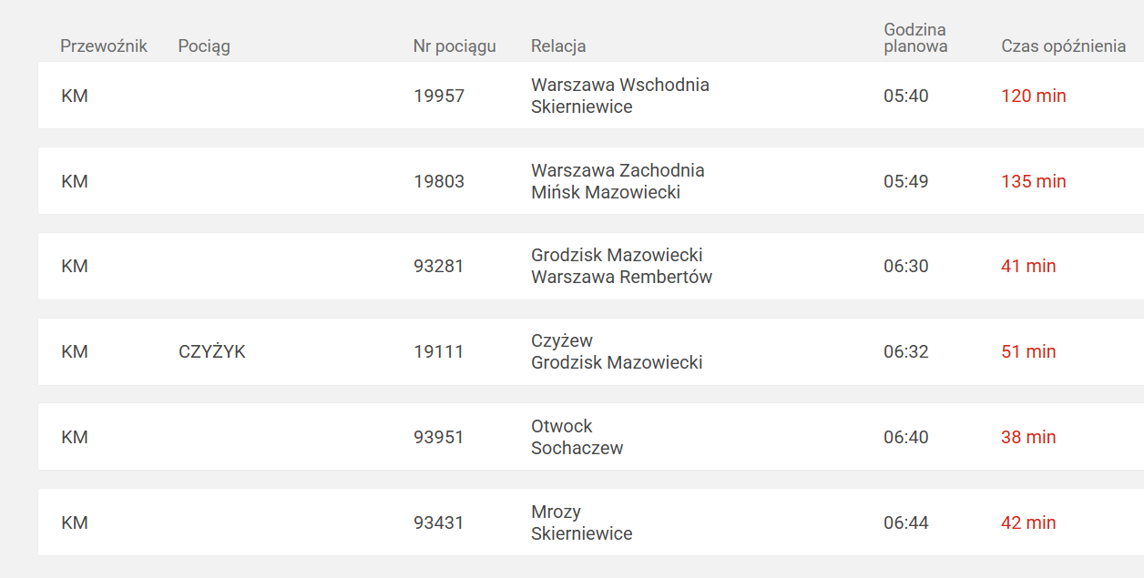 Problemy dotyczą też połączeń realizowanych przez Koleje Mazowieckie. Obecnie (stan na g. 7.35) opóźnienia niektórych pociągów wynoszą nawet 45 minut. W oficjalnym komunikacie PKP PLK czytamy, że opóźnienia mogą wynosić do pół godziny. "Wybrane pociągi kierowane są przez Warszawę Centralną" - podaje spółka.