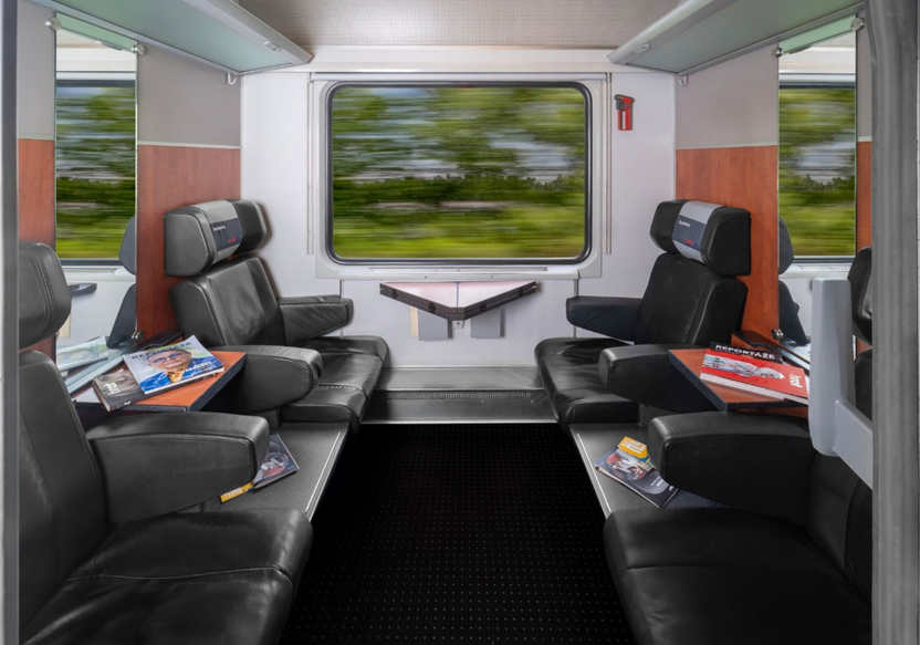 - Business (1. klasa) – duże skórzane fotele w przedziale dla czterech pasażerów. W cenie biletu zawarte są sok, kawa i woda.