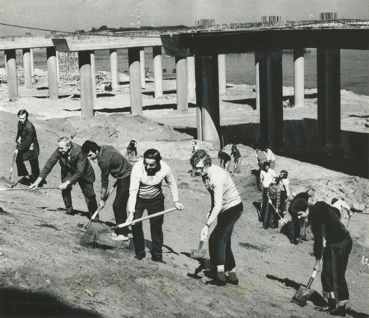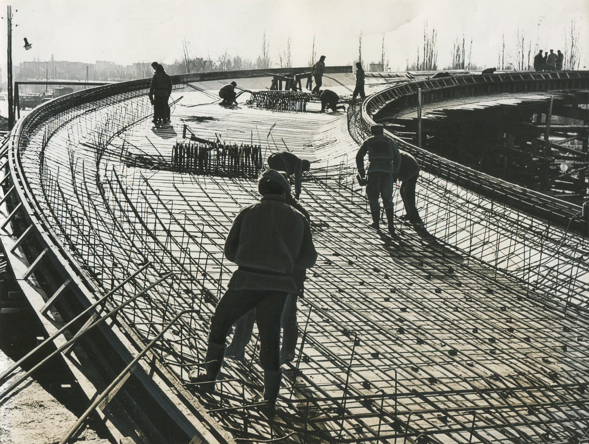 Centralnym elementem była przeprawa przez Wisłę – most Łazienkowski o długości 423 metrów. (...) Podpory – cztery w nurcie Wisły i dwie na lądzie – wykonano z żelbetu, świadomie rezygnując z granitowej okładziny. Montaż konstrukcji stalowej prowadził Mostostal; z uwagi na napięty harmonogram prace toczyły się także nocą przy świetle reflektorów. Elementy nasuwano z obu brzegów na rolkach, a montaż ostatniego elementu przęsła brzegowego zakończono na początku grudnia 1973 roku.