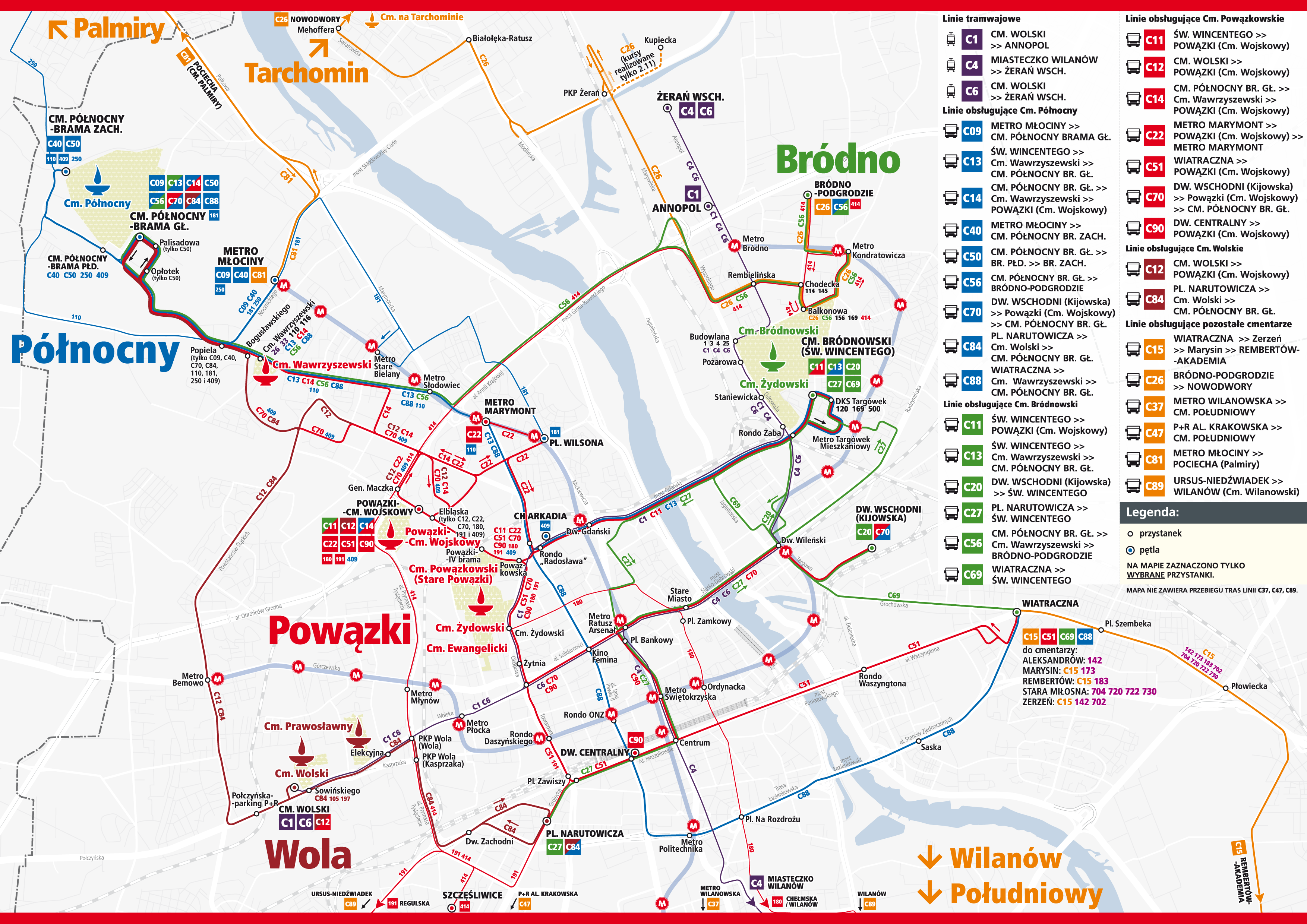 Autobusy i tramwaje linii cmentarnych we Wszystkich Świętych pojawią się na ulicach między 7.00 a 19.00, a w Dzień Zaduszny będą jeździć od 9.00 do 17.00. Wyjątkiem są linie, które dowożą pasażerów w okolice Cmentarza Powązkowskiego. Wiele osób wybiera się tam na spacer po zachodzie słońca, kiedy już odwiedzą groby rodzinne w innych rejonach Warszawy i dlatego autobusy linii C11 i C22 w oba dni będą jeździły dwie godziny dłużej (C22 do ok. godz. 22.00), a linii C09, C12 i C51 dłużej o godzinę.