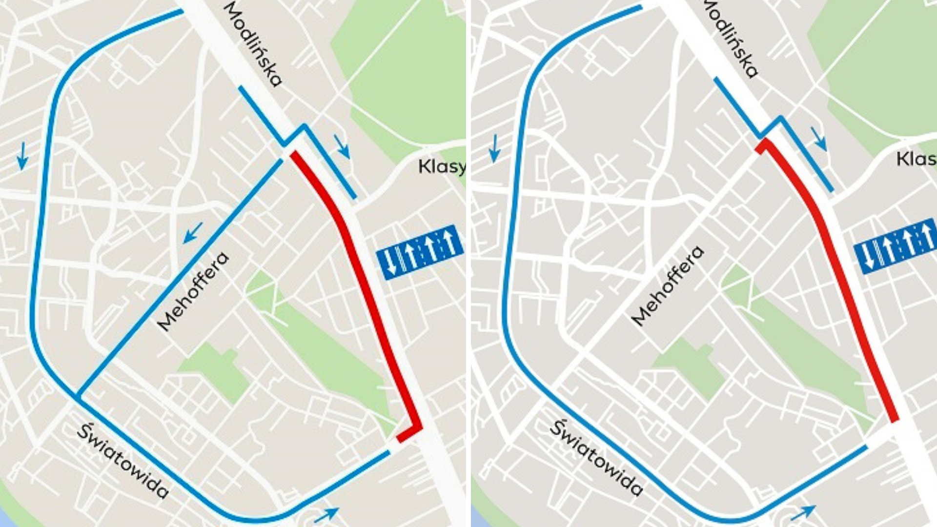 Utrudnienia będzie można ominąć ulicą Światowida. Remont obejmie również skrzyżowania ulic Modlińskiej ze Światowida oraz Mehoffera.