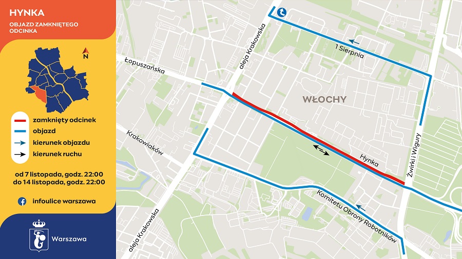 Przez tydzień nitka ulicy Hynka w stronę Łopuszańskiej będzie zamknięta od ulicy Żwirki i Wigury do alei Krakowskiej. Początek prac w piątek, 7 listopada, około godz. 22. Koniec w piątek, 14 listopada, o godz. 22. W tym czasie kierowcy będą jeździli w obu kierunkach drugą jezdnią.