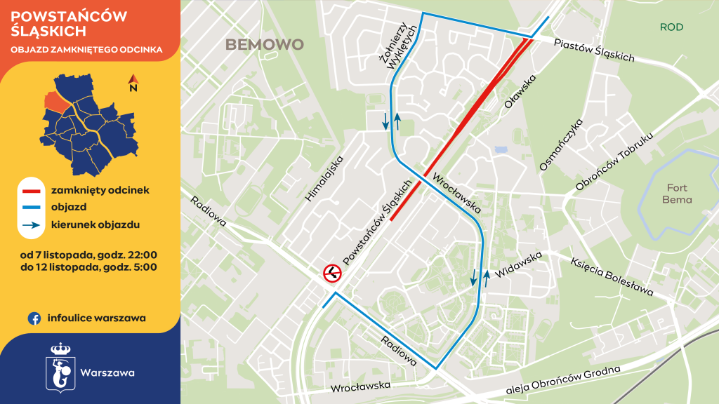 Od piątku, 7 listopada, od godz. 22 do 5 w środę, 12 listopada zamknięte będą obie jezdnie ulicy Powstańców Śląskich — od Piastów Śląskich do około trzystu metrów przed ulicą Radiową. Objazd podczas frezowania został wyznaczony ulicami: Radiową, Wrocławską, Żołnierzy Wyklętych i Piastów Śląskich. Skrzyżowanie z Wrocławską pozostanie otwarte.