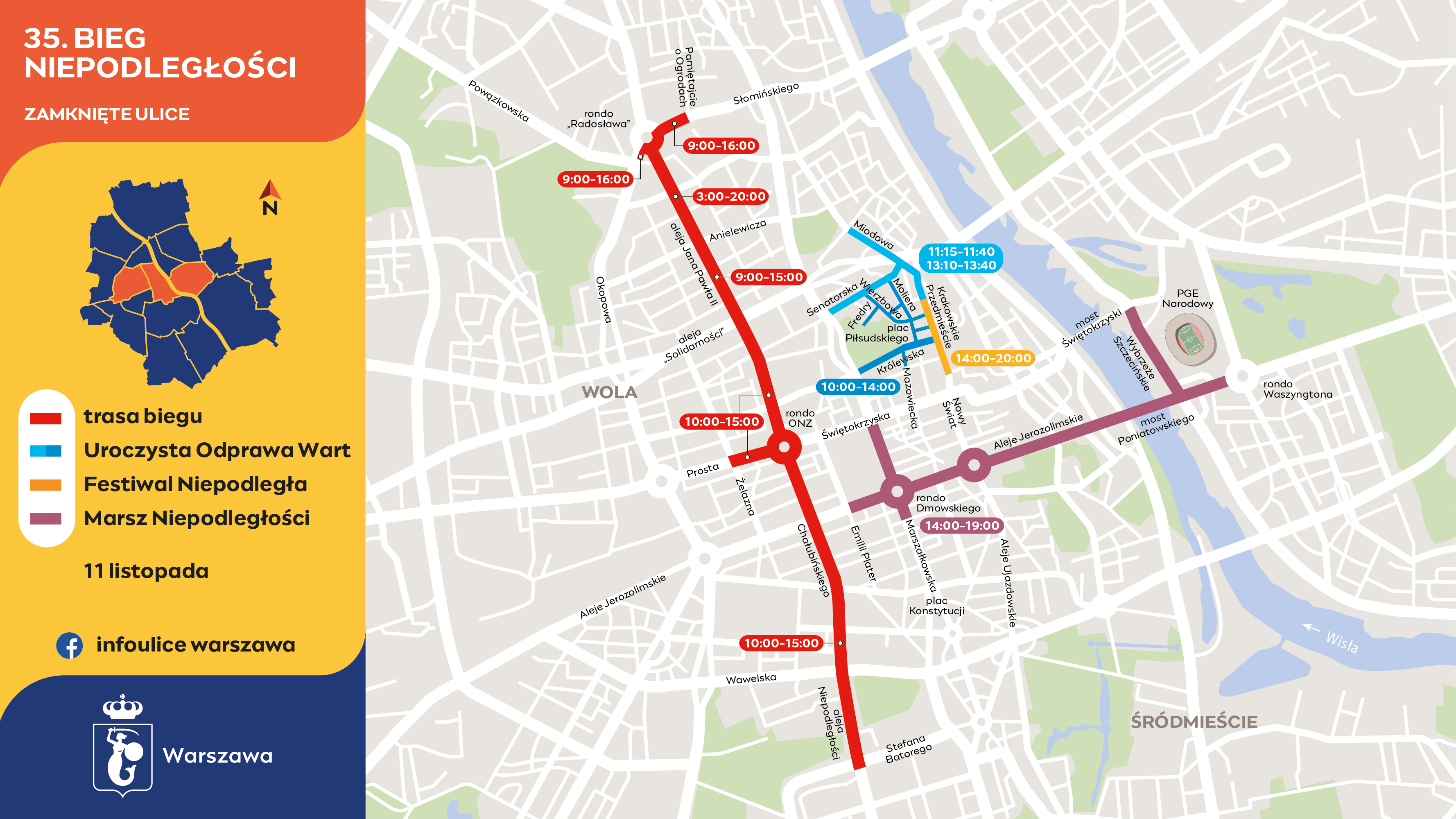 Ulica Marszałkowska zostanie zamknięta od Żurawiej do Świętokrzyskiej, a Aleje Jerozolimskie od Emilii Plater do mostu Poniatowskiego. W czasie wydarzenia policjanci mogą zamknąć również Wisłostradę pomiędzy Ludną a mostem Śląsko-Dąbrowskim. Tramwaje i autobusy pojadą objazdami.