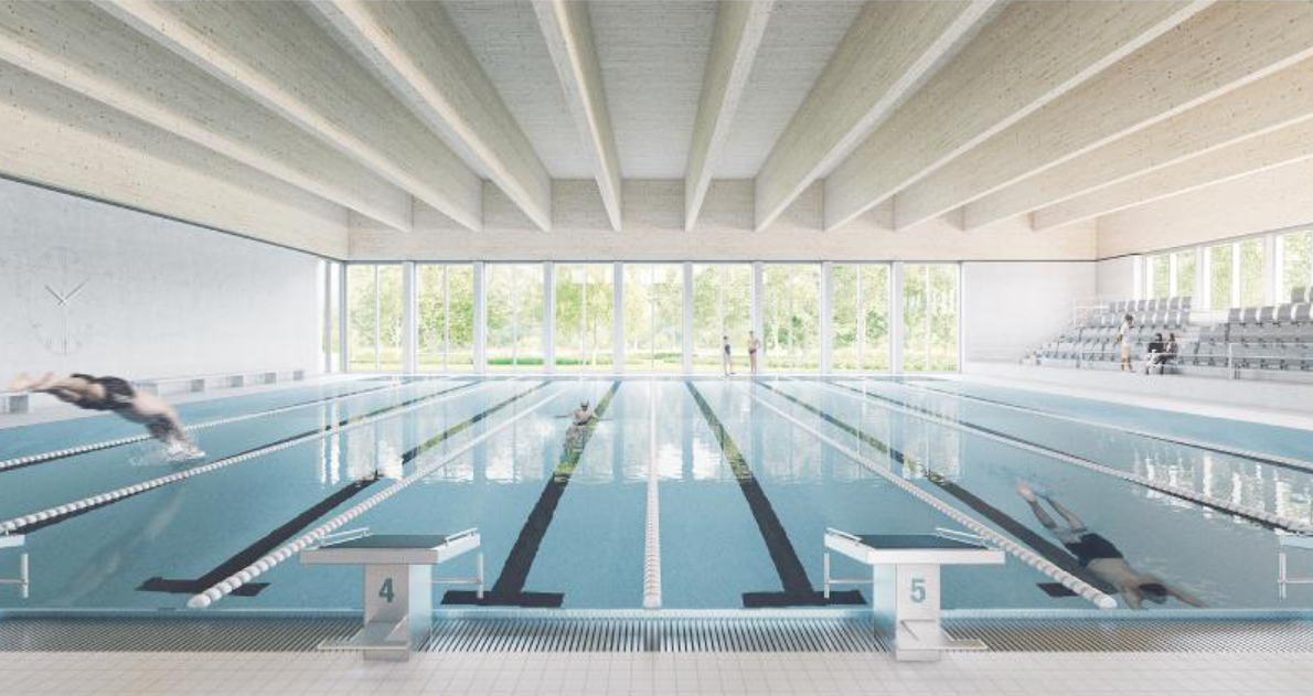 W jego wschodniej części powstanie hala basenu sportowego z ośmioma torami oraz widownią dla 150 osób, w tym z miejscami dla osób z niepełnosprawnościami. Obok znajdzie się basen rekreacyjny ze strefą relaksu – z biczami wodnymi, leżankami i gejzerami – a także blok saun i przestrzeń wypoczynkowa z widokiem na zieleń parku. Uzupełnieniem części wodnej będą basen do nauki pływania o głębokości 0,8–1,35 m oraz brodzik dla dzieci o głębokości do 0,3 m. Wszystkie niecki basenowe zostaną wykonane ze stali nierdzewnej, co ma zapewnić trwałość, higienę i łatwość utrzymania.