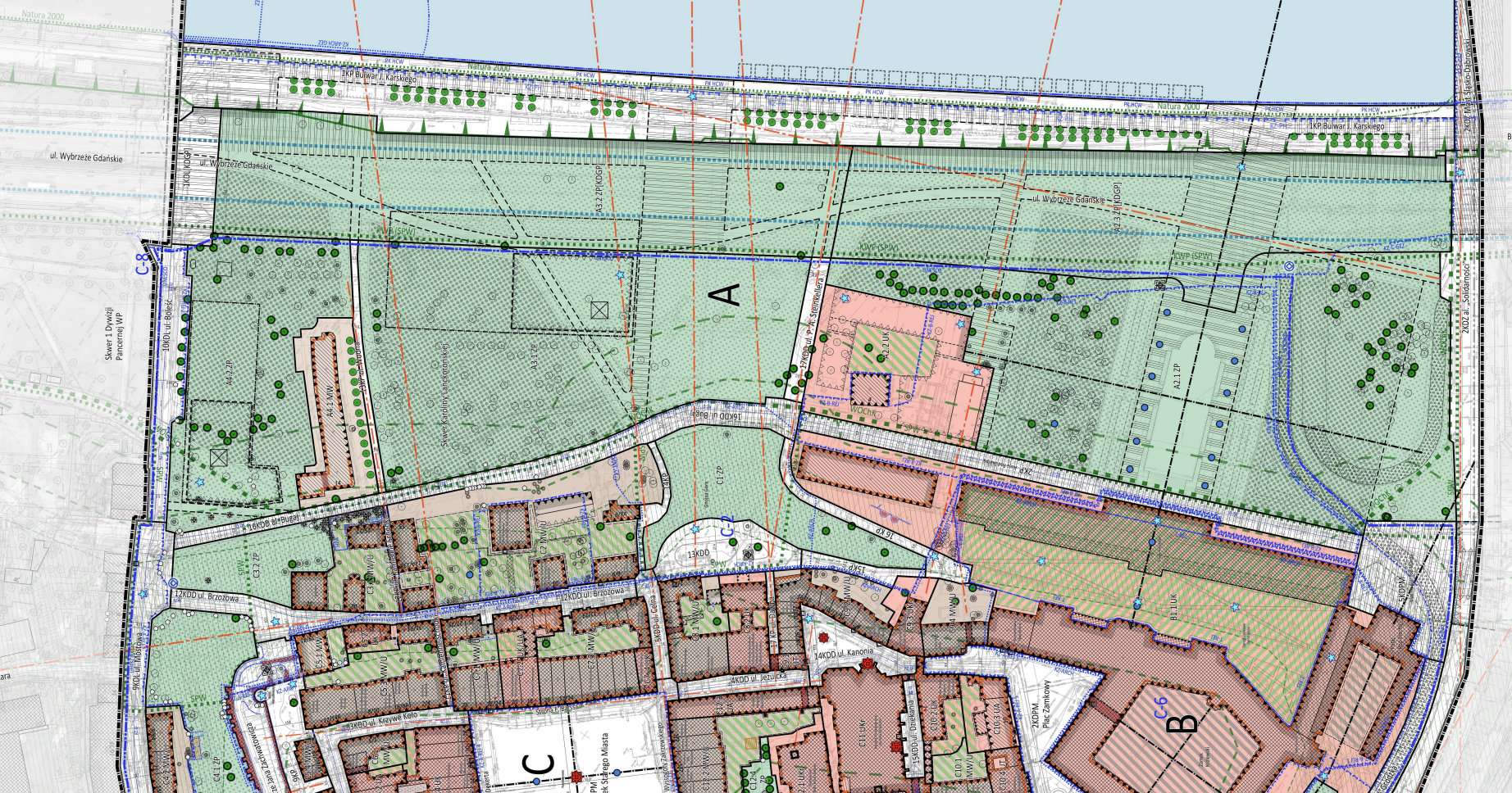 Większość terenu zajmują zabytki, wpisane na listę UNESCO, wobec tego na skarpie radykalnych zmian nie będzie. Ciekawiej robi się poniżej. Teren ten zajmują Ogrody Zamku Królewskiego, a także Wisłostrada i miejski parking „Bugaj”. Tam zaplanowano spore zmiany. Docelowo Wisłostrada powinna zostać „schowana” w tunelu. Musi on być zbudowany tak, by żadne z urządzeń technicznych nie zasłaniało „widoków na obiekty zabytkowe”, ani panoramy miasta. Aż 90 proc. odzyskanego w ten sposób terenu ma zostać zamienione na zieleń.