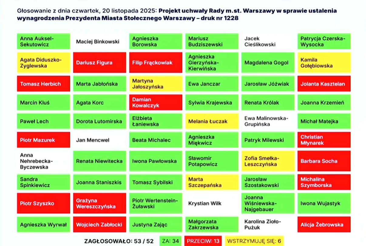 W uzasadnieniu podał, że pensja Trzaskowskiego wzrośnie do „poziomu maksymalnego dopuszczalnego przez prawo”. To 11,2-krotność kwoty bazowej. Biorąc pod uwagę, że propozycję przygotował szef klubu KO, głosowanie było jedynie formalnością. Mimo to opozycja (PiS) jasno dała do zrozumienia, że nie poprze zmian.